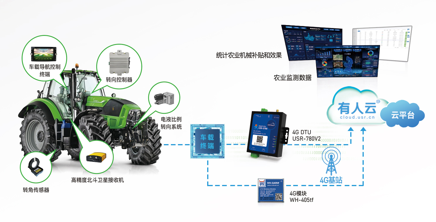 在大型农业拖拉机上安装物联网监控终端,将4G DTU设备与相应的物联网监控终端相连,通过4G网络,将采集的数据和图像实时上传到农机监控平台,从而达到展示农业监测数据、统计农业机械补贴和耕种效果的目的,助力农业机械物联网农业现代化的推进。