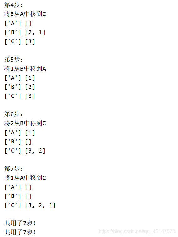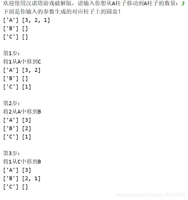 # 用于实现从A柱子上将n个圆盘移到C柱子上